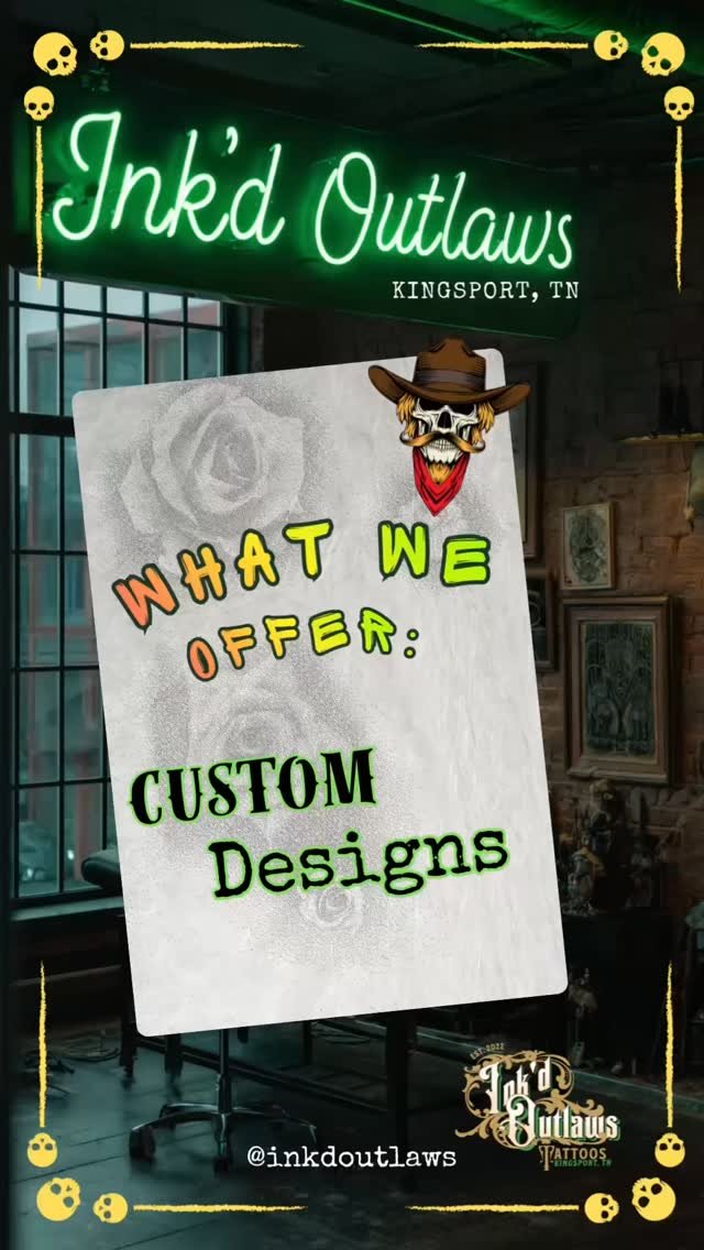 Ink’d Outlaws is a locally owned tattoo studio in Kingsport, TN. We’re known for custom tattoo work, a welcoming shop atmosphere, and artists with experience across multiple styles, including black-and-grey realism, fine-line, traditional, color, reworks, and cover-ups.